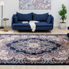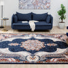 Add a touch of royal elegance to your home with the Isfahan Floral Medallion Navy Area Rug, a refined fusion of Afghan and Persian craftsmanship. The rug features a striking floral medallion centered within intricate vine and lace-like patterns, surrounded by ornate borders in deep navy, ivory, r...
