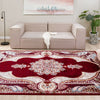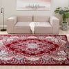 Elegant Royal Arch Medallion with traditional Persian-Afghan detailing Soft, silk-pile surface that mimics the feel of hand-woven luxury Durable and stain-resistant, perfect for family-friendly spaces Rich red tones balanced with ivory, beige, and soft blue accents Adds depth, warmth, a...